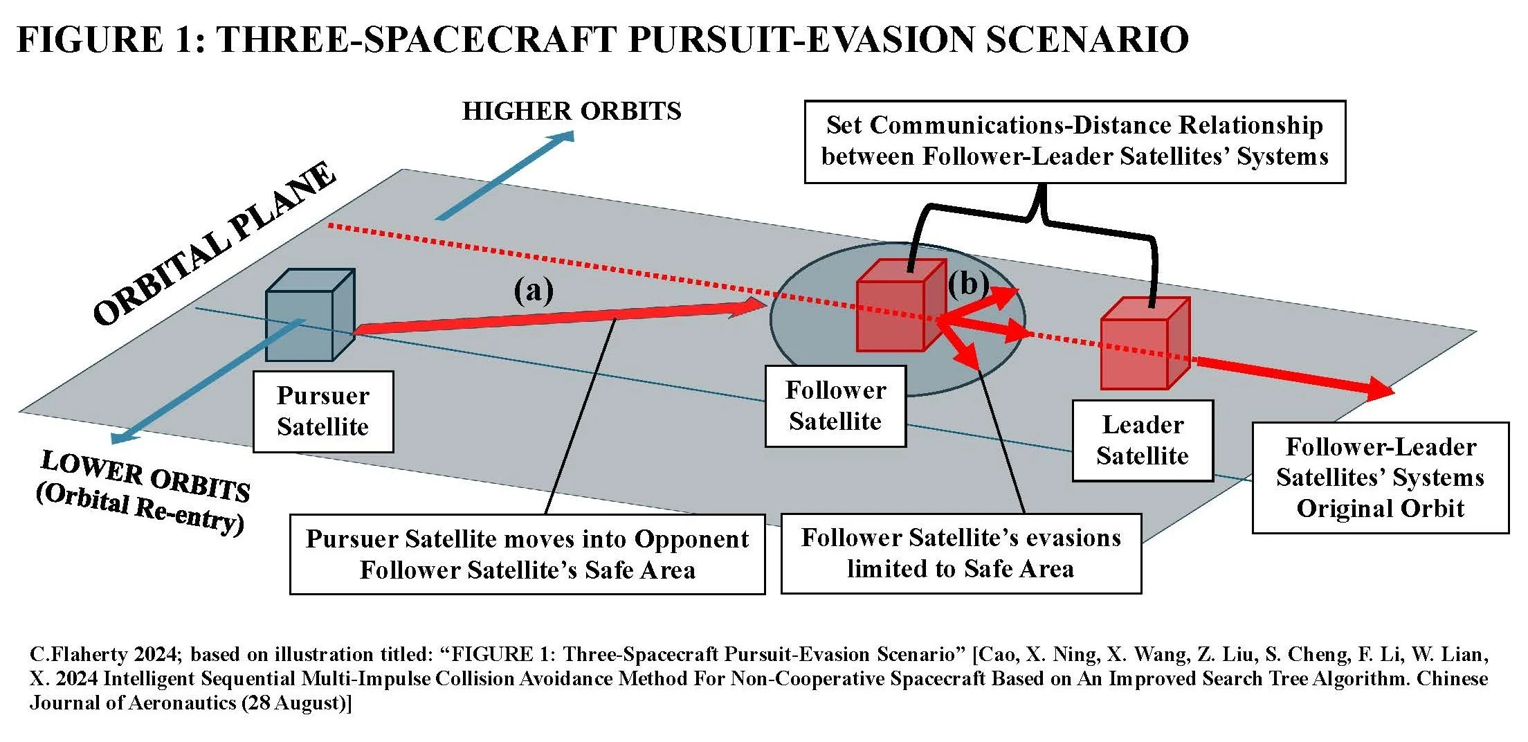 An Orbital Manoeuvre Tactical problem of a Three-Spacecraft Pursuit-Evasion Scenario posed in a 2024 research paper looks at, “actively approaching non-cooperative targets … where … the pursuer aims to approach the evader and the evader tries to escape from the pursuer’s approach.” [Cao, X. Ning, X. Wang, Z. Liu, S. Cheng, F. Li, W. Lian, X. 2024 Intelligent Sequential Multi-Impulse Collision Avoidance Method For Non-Cooperative Spacecraft Based on An Improved Search Tree Algorithm. Chinese Journal of Aeronautics (28 August)].
